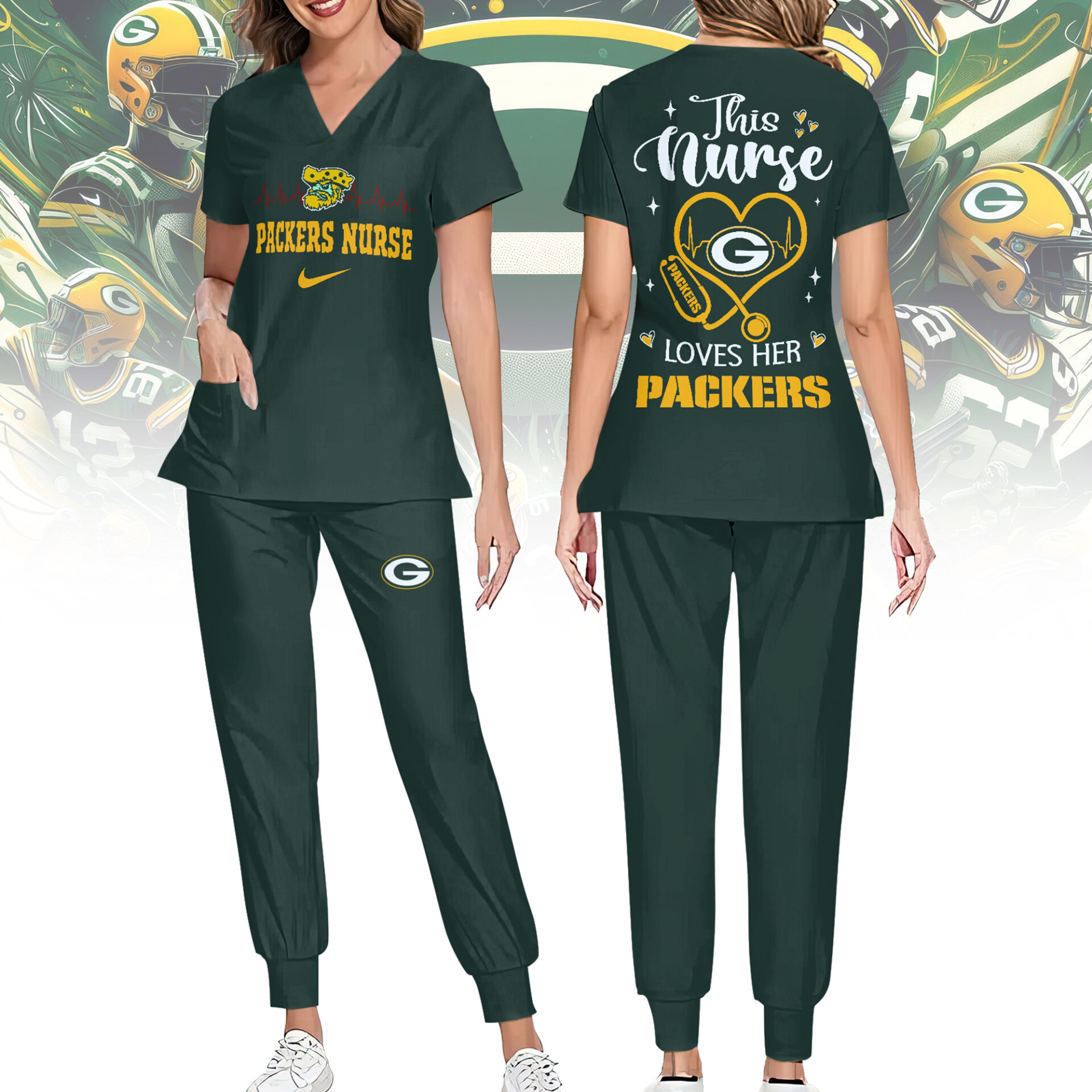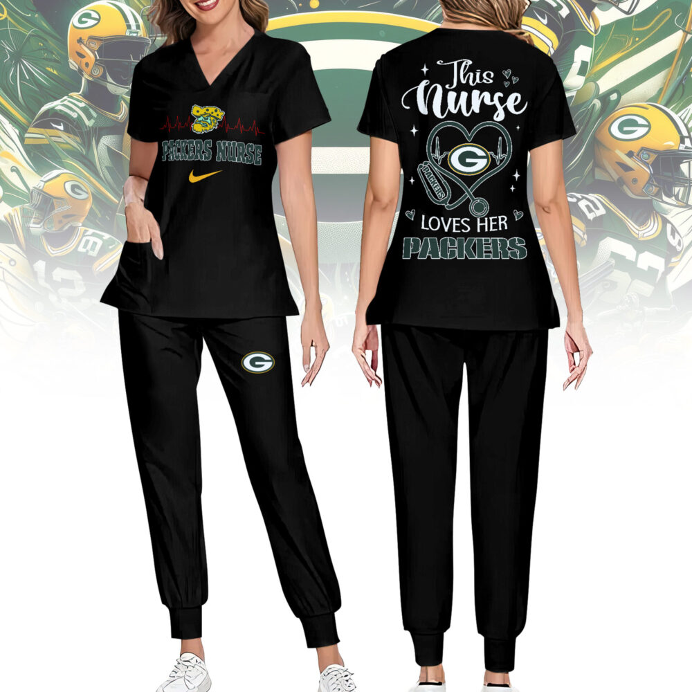 Green Bay Packers | Premium NFL Nurse Appreciation Stretch V-Neck Scrub Top And Jogger Pant NY